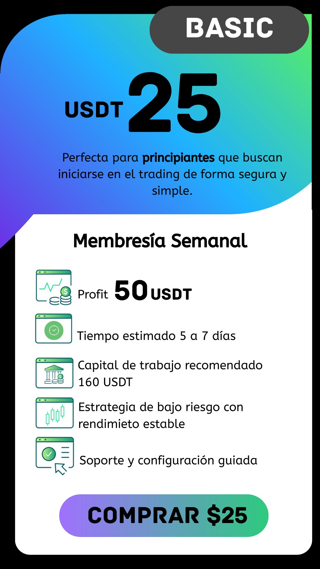 Con la membresía BASIC, el capital requerido de USDT 160, ideal para comenzar a operar con bajo riesgo y descubrir todo el potencia de TRADIXBOT de forma automatizada.